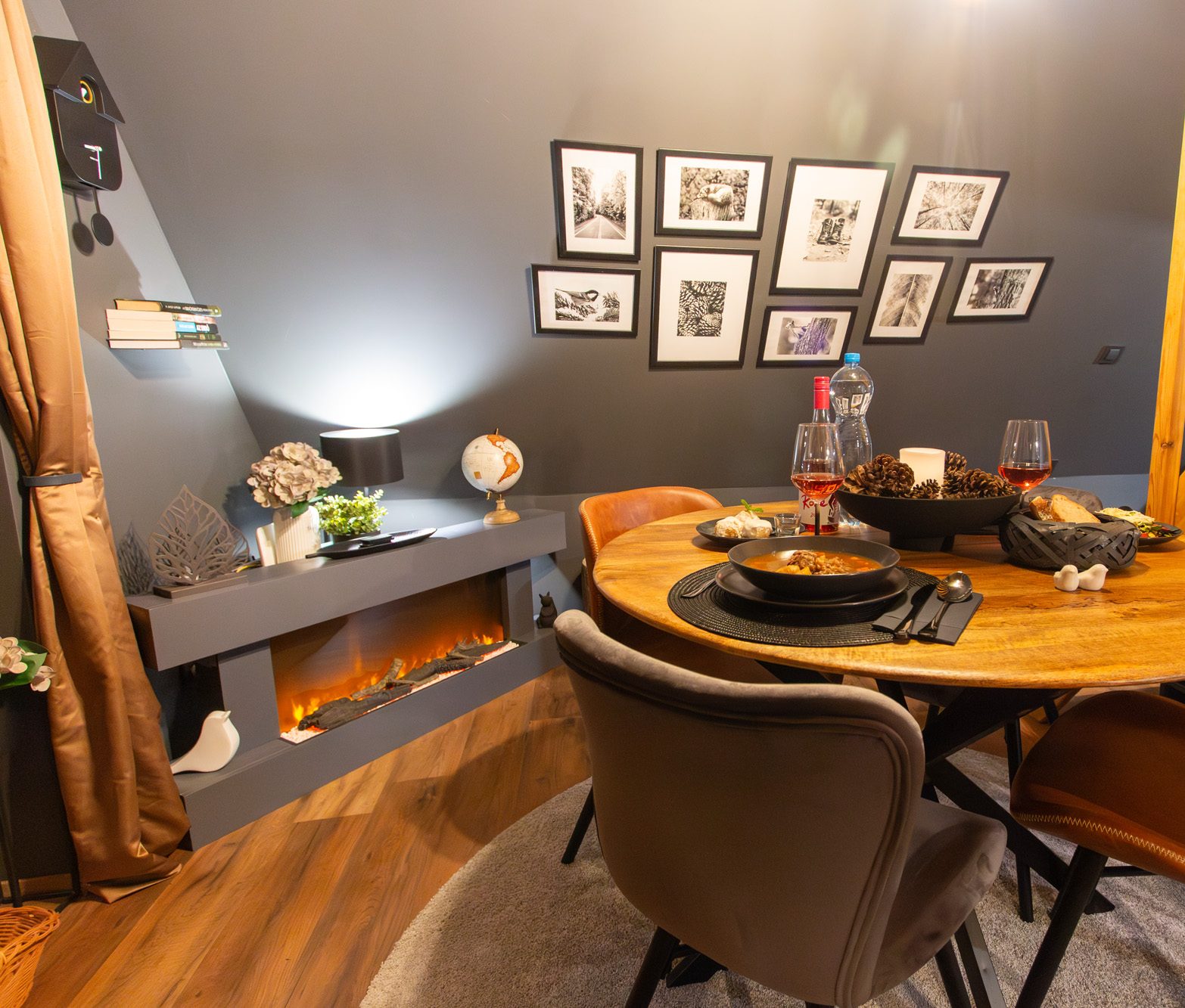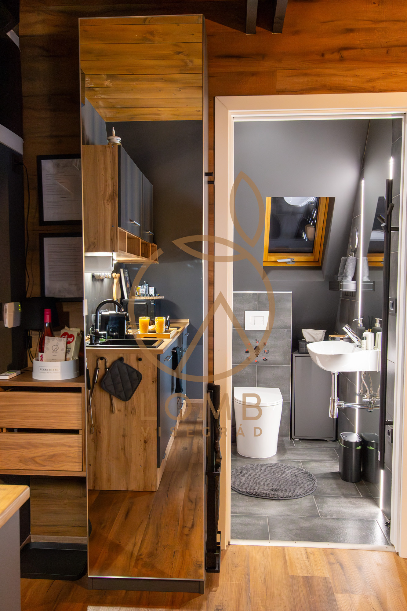 A ház két szintes, a földszinten található a jól felszerelt konyha, étkező, egy zuhanyzós fürdőszoba és a látványkandallós nappali, valamint a panorámás, pihenőhálós terasz dézsafürdővel és tűzrakóval.